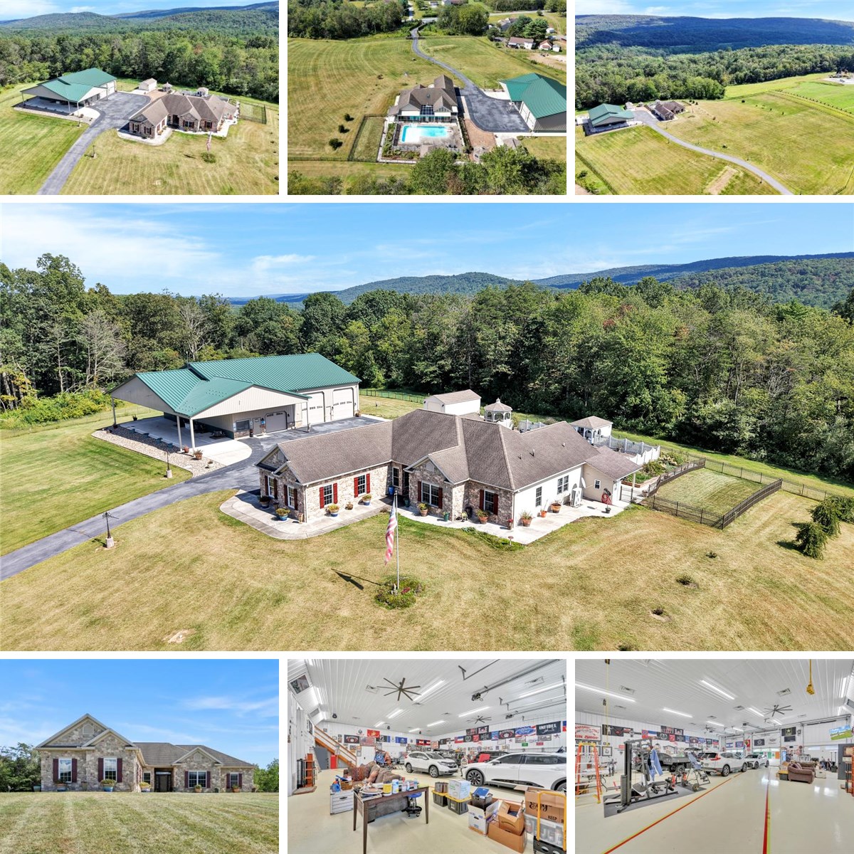Welcome to paradise! Pass through the electronic gated entrance and follow the winding paved driveway, beautifully lined with light posts, to this custom-built ranch home on 8 private acres. The property is fully fenced, offering peace, privacy, and security. Inside, you’ll love the open floor plan, highlighted by a stunning stone gas fireplace. The chef’s kitchen comes fully equipped with appliances, recessed lighting, and a spacious pantry. The primary suite is truly a retreat, featuring a walk-in closet, custom tile shower, jacuzzi tub, and breathtaking views of the mountains and pool. Two additional bedrooms share a convenient Jack & Jill bathroom, while a 3-season sunroom floods the home with natural light and panoramic views. Additional interior features include an Omni interactive system, built-in speakers throughout, a sunroom spanning the back of the home overlooking the pool, and a whole-house generator for peace of mind. The attached garage provides protection for your vehicles. Step outside to your backyard oasis, complete with a heated in-ground pool with diving board, pool shed (with all supplies and equipment), a fenced-in pet area, and an oversized Trex patio with fire pit for entertaining. But that’s not all—car enthusiasts and hobbyists will fall in love with the detached garage offering over 2,800 sq. ft. of space, propane heat, air conditioning, its own generator, office, bar/movie room, full bathroom, and loft-style living quarters. It easily stores 9+ cars, an RV, or equipment, with additional carport parking. Located just minutes from Swatara State Park, the Appalachian Trail, horseback riding, hiking, biking, and with quick access to I-81, this property combines luxury, privacy, and convenience. ?? This one-of-a-kind estate will not disappoint—make it yours today before it’s gone! ??
